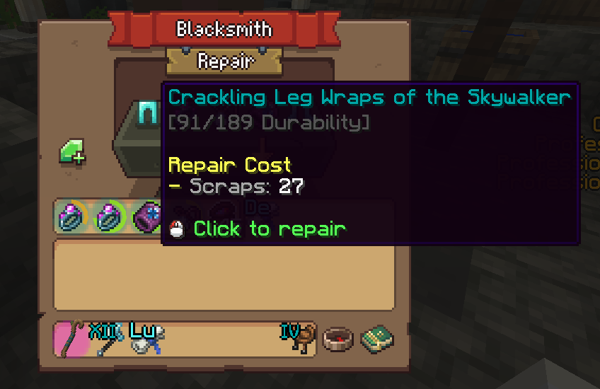 「鍛冶屋?そう、アイテム・バイヤーは鍛冶屋として知られるようになったのだ。エメラルドでアイテムを買い取ってくれることに変わりはないが、アイテムをスクラップにして売ることもできるようになった。スクラップは壊れたクラフトアイテムの修理に使われる。一般的に、低Tierのアイテム(ノーマル/ユニック)を使うことは、スクラップを低コストで簡単に手に入れる良い方法である。