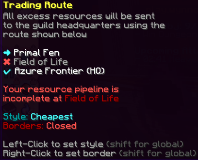 Cheapestの場合、最もTaxが掛からないかつ最短距離のテリトリーを経由して資源が移動します。''要は他ギルドの領地を介さずに遠回りして資源を移動させます。遠回りできない場合は普通に最短距離を突っ切ります。