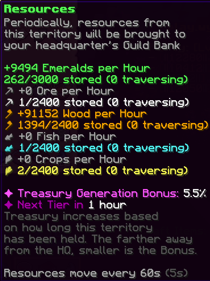 テリトリー取得時、少量の各種資源が手に入り、その領地固定の資源とエメラルドの生産を開始します。Strategist以上のランクを所有するプレイヤーはその資源を使ってタワー、テリトリー、ギルド等に対して様々なバフを施すことができます。