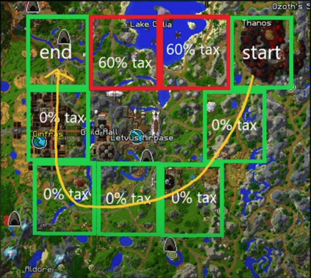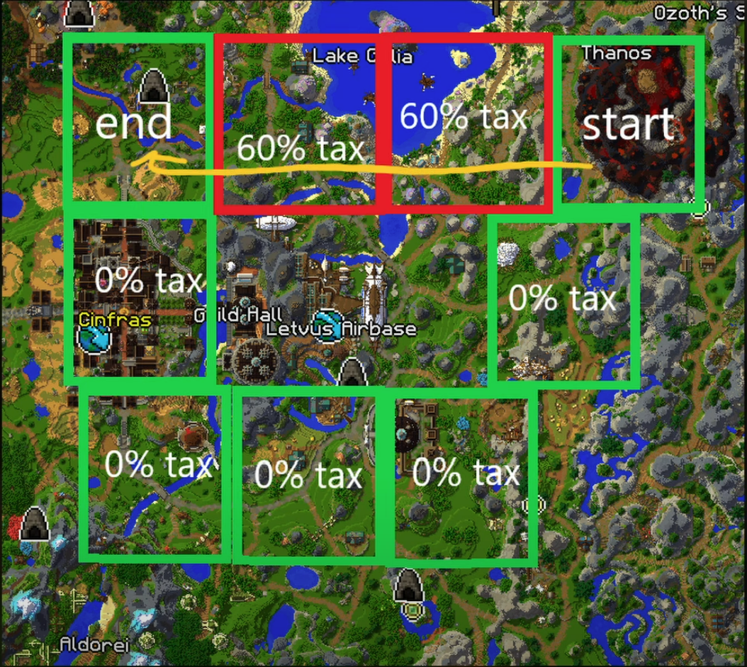 これの何が問題かというと、思いっきり他のギルドのテリトリーも突っ切っていくでことす。前述した通り資源が他ギルドの領地を介して移動した時、掛かっているTax分資源が取られます。